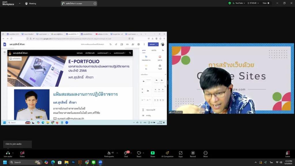 โครงการอบรมออนไลน์ “การประยุกต์ใช้ Google Site เพื่อเพิ่มประสิทธิภาพการจัดการเรียนรู้และการประเมินวิทยฐานะ” ได้ดำเนินการเสร็จสิ้นลงอย่างเรียบร้อย ตลอดระยะเวลาการอบรม ผู้เข้าร่วมได้รับความรู้และแนวทางเชิงระบบในการนำ Google Site มาประยุกต์ใช้เป็นเครื่องมือสำคัญในการจัดการเรียนรู้และการจัดเก็บหลักฐานทางวิชาการ ทั้งในมิติของการออกแบบแหล่งเรียนรู้ออนไลน์สำหรับผู้เรียน การจัดทำคลังสื่อ/แหล่งเรียนรู้ประกอบรายวิชา ตลอดจนการจัดทำแฟ้มสะสมงาน (Portfolio) และหลักฐานเชิงประจักษ์ที่เกี่ยวข้องกับการขอมีหรือเลื่อนวิทยฐานะในรูปแบบดิจิทัลอย่างเป็นระบบและตรวจสอบได้