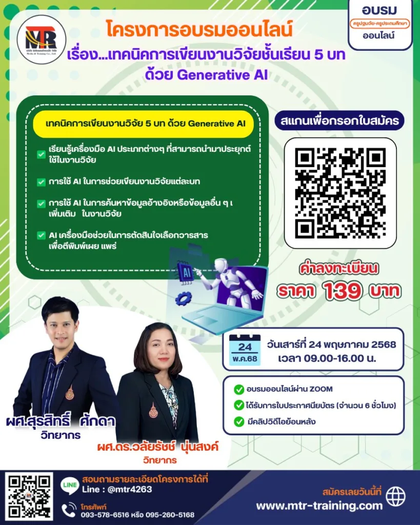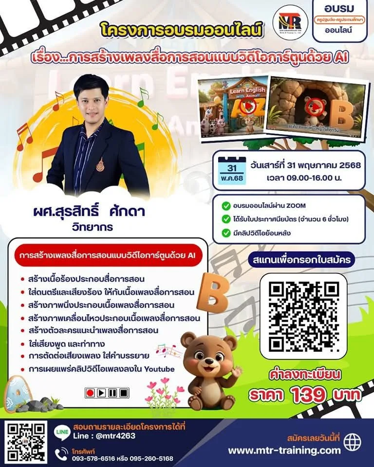 โครงการอบรมออนไลน์ครั้งนี้จัดขึ้นเพื่อพัฒนาศักยภาพครูและบุคลากรทางการศึกษาในการผลิตสื่อการสอนรูปแบบใหม่ ผ่านการสร้างเพลงประกอบการสอนควบคู่กับวิดีโอการ์ตูนโดยใช้เทคโนโลยี AI เพื่อเพิ่มความน่าสนใจ กระตุ้นการมีส่วนร่วมของผู้เรียน และช่วยให้เด็กสามารถจดจำเนื้อหาได้ง่ายและสนุกยิ่งขึ้น การอบรมจะถ่ายทอดกระบวนการออกแบบเพลง การใส่เสียงร้อง ดนตรี และสร้างภาพประกอบหรือแอนิเมชันให้สอดคล้องกับเนื้อหาของบทเรียน เหมาะสำหรับ รายละเอียดการอบรม วิทยากรผู้เชี่ยวชาญ ลงทะเบียนเลยที่👉https://reg.mtr-training.com/f.php?project_id=71ค่าลงทะเบียน 139 บาทสอบถามรายละเอียดเพิ่มเติมได้ที่Line ID: @mtr4263 (บริษัท มีเดียแอนด์เทรนนิ่ง จำกัด)โทรศัพท์: 093-578-6516 หรือ 095-260-5168 (คุณกบ)