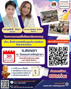 เรื่อง สื่อสร้างสรรค์เพื่อครูยุคใหม่สุดครีเอท ด้วย AI & Canva โครงการอบรมครั้งนี้จัดขึ้นเพื่อส่งเสริมและพัฒนาศักยภาพของครูและบุคลากรทางการศึกษาให้สามารถออกแบบสื่อการเรียนรู้ที่สอดคล้องกับยุคดิจิทัล ผ่านการประยุกต์ใช้เทคโนโลยีปัญญาประดิษฐ์ (AI) และโปรแกรม...